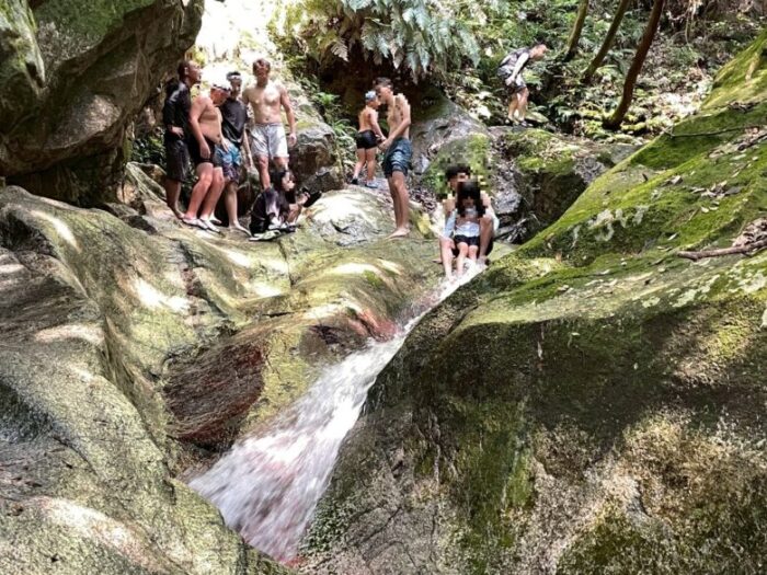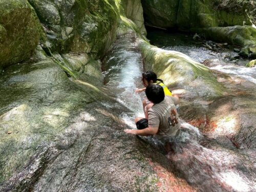 岩場にそって、ビュンビュンとジグザクに進む滝すべりになっていて、すべってみると一瞬ですが、このスリルがたまりません!