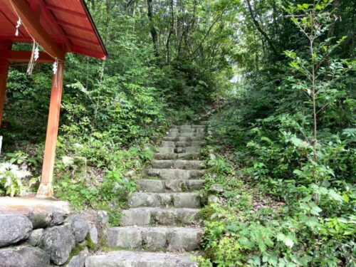 するとそこには階段があり、左手に山の神様のお社があるので、こちらにご挨拶して、石段を登っていきます。