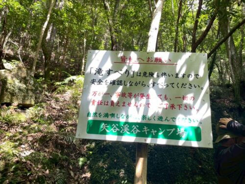 キャンプ場の入口から奥に入ると、「天然滝すべり」の案内板があるので、看板で指示されている矢印方向へと向かいます。