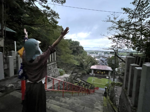 長い階段を上って温泉神社に到着。日奈久温泉街から海まで見渡せました。気持ちいい!