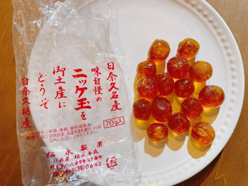 お土産はニッケ玉という昭和感あふれるアメちゃん。キラキラしててかわいい。味はめっちゃシナモンです。