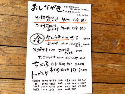 ごぼう天はかき揚げタイプでボリューミー、トッピングは別皿になります。