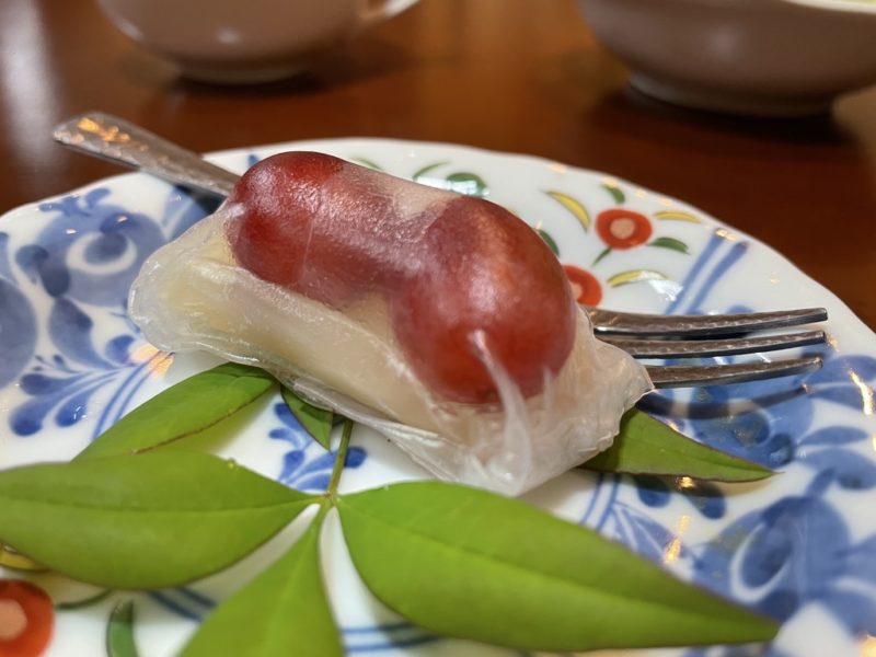 葡萄を大福風アレンジ、生春巻きでくるんだデザートでした。