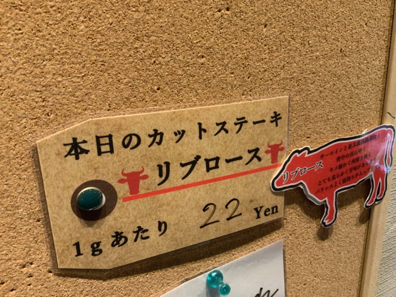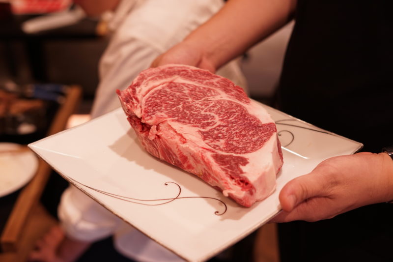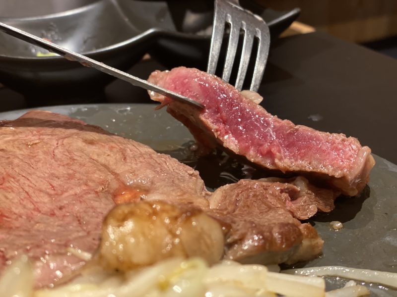 運ばれてきたステーキは、ブロックをそのままスライスしたサイズで、大体200~300gあるそう。これで250gくらい。単品だと1g22円なので、すでにこの時点で5500円分くらい。スタート時点で元取れてしまったやん。