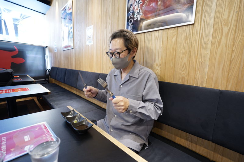 そして、開始から1分とたたず、山田、1枚目、完食。ちゃんと噛んでるのかと心配されましたが、めっちゃ噛んでます。美味しくてバクバク進んじゃうので、Pカイトはまだ肉を切り分けている最中でした。