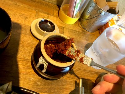 これが博多名物の「辛味噌」です。この辛味噌の調合も、博多では各店によって好みの違いがあるようですね。これをお肉やキャベツに付けて食べるとまた絶品!