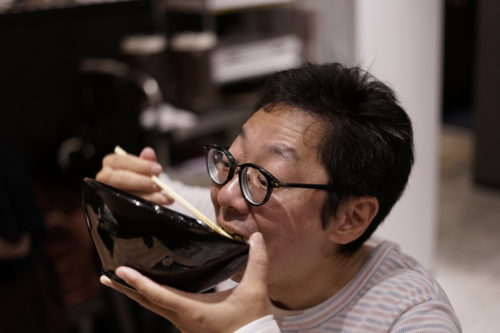 私は肉そのものよりも、ついつい丼ぶりを抱えてまでも、かっこんでしまう姿にしました。