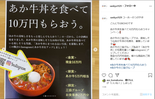 ・キャンペーン用のハッシュタグ(#あか牛丼食べて10万円もらおう もしくは #あか牛の三協グループ)をつけて投稿