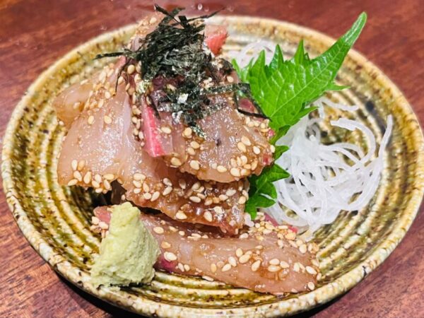 次は胡麻カンパチ。ぷりぷりのカンパチにたっぷりの胡麻タレ。胡麻の風味がたまりません!味がしっかり染み込んでいて、食欲を掻き立てる味です。