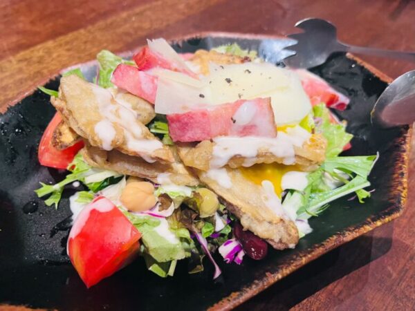 野菜メニューの中で、お店おすすめのガリガリごぼう天の温玉サラダ。