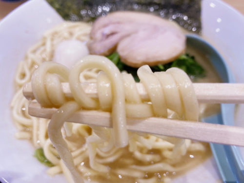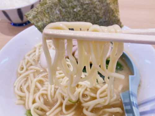 こってりのイメージのある家系ラーメンですが、スープは半透明で意外にサラサラ。