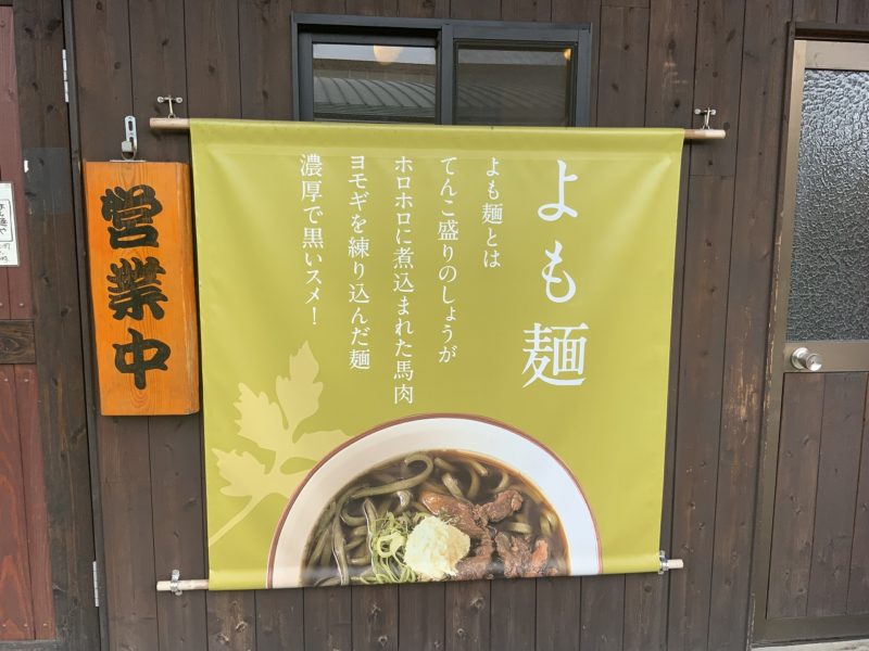 入り口に掲げられた説明だけではやくも美味しそう!よもぎを練り込んだ麺に馬肉にしょうが!たまらんすね!