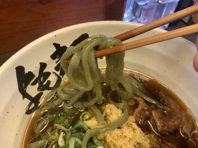 よもぎを練り込んだ麺は、うどんと中華麺の中間くらい。意外なほどにつるつるしているのに、コシもあり不思議な触感。