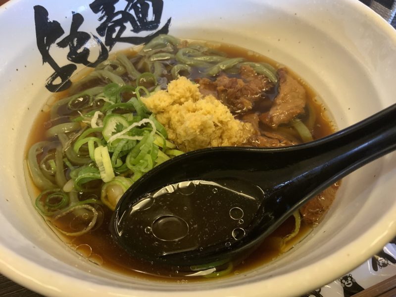 先によも麺が到着!濃いスープから緑色の麺が覗き、馬肉とネギ、そして大量の生姜が盛られています。