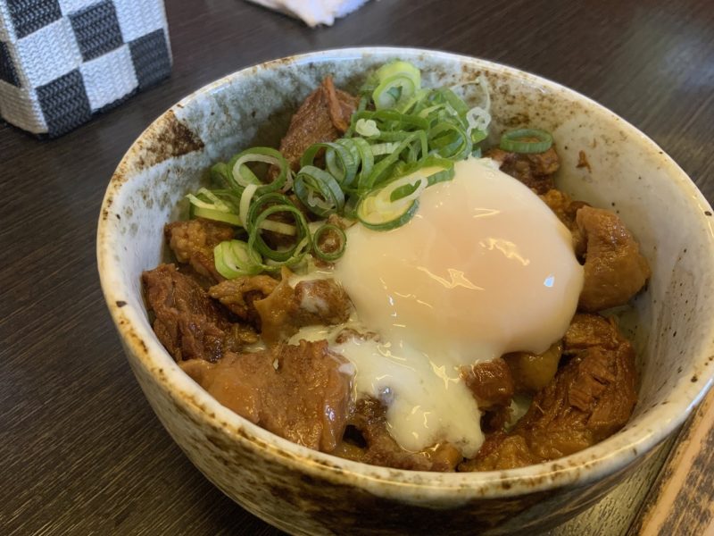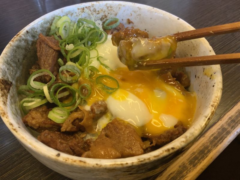 よも麺に夢中になっているときに運ばれてきた馬すじ丼も半熟卵がのってたまりません。