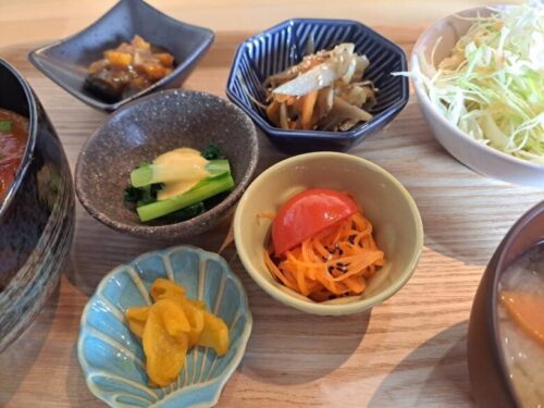 サラダや漬物、野菜4種の小鉢も付いていて、歯ごたえと野菜の優しい旨味を与えてくれるので
