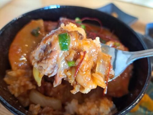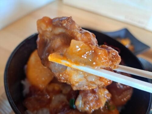 トロトロ豚なんこつピリ辛丼は、箸やスプーンで切れるくらい豚なんこつが柔らかくて量もあり食べ応え十分。