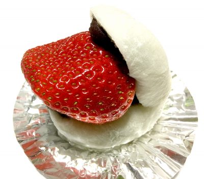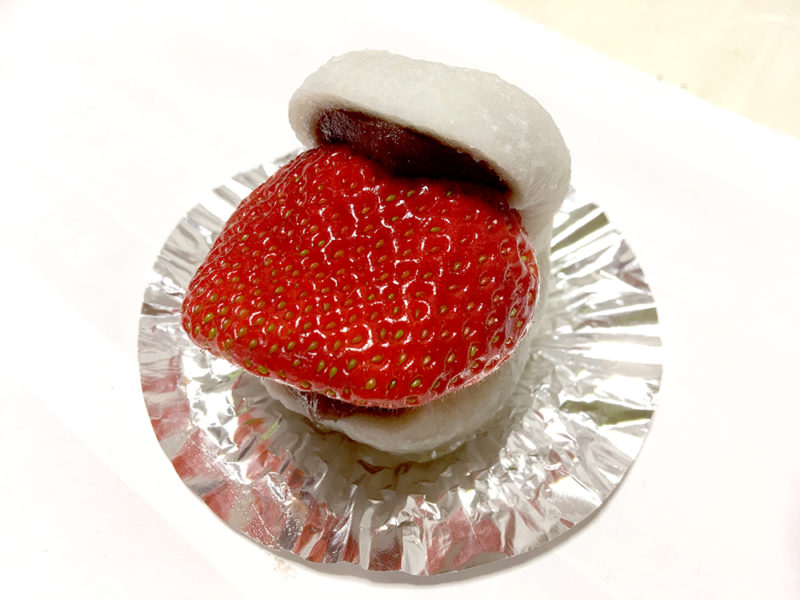 これは美味しそう!はみ出んばかりの“いちご”を大福がサンドしています。まるで佐世保バーガー並みのボリューム感!