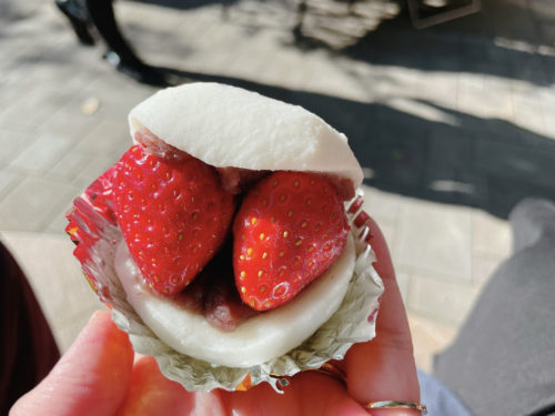 トレードマークである大きな大きないちごを受け止めるには、このくらいしっかりした餅生地がベストバランスかも。