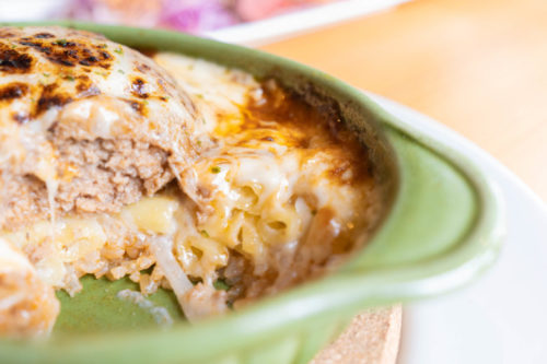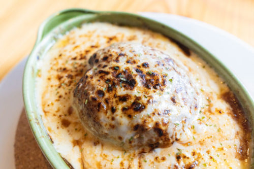 表面にこんもり乗った肉厚ハンバーグに炙りチーズが覆ってて、中身もマカロニとご飯を組み合わせてることでお米と小麦、一度に二度美味しいドリアとして仕上がっています。