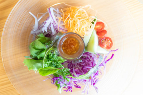 自家製サラダは、横からも真上からも彩豊かで活き活きした野菜たちが並んでました。