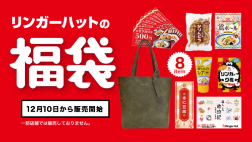 お値段3,500円とお手軽ながら、オリジナルトートバックや3,000円分のお食事券付きなど豪華ラインナップで毎年人気なリンガーハットの福袋。