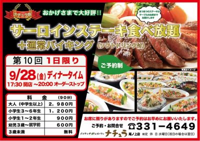 ナチュラは週末はディナーもありますが、9月28日(金)は毎月開催されているナチュラ祭ということで、サーロインステーキも食べ放題もあります!予約制なのでお早めに!