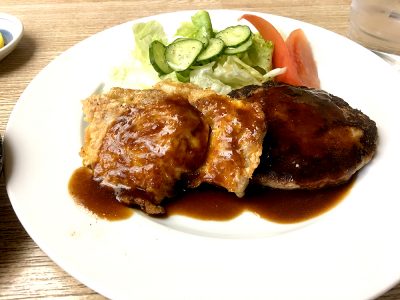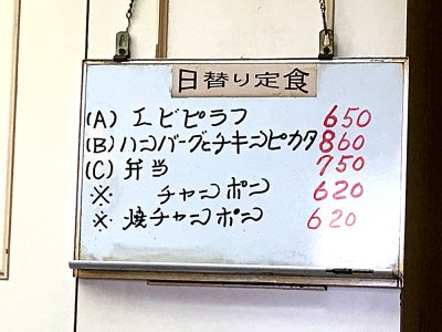「ハンバーグとキチンピカタ」のチキンピカタってなんじゃ?「弁当」って何!?喫茶店だけど「ちゃんぽん」もあります。