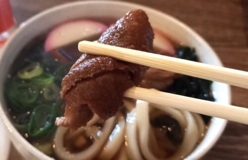 馬すじうどん(500円)とおにぎり(150円)