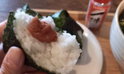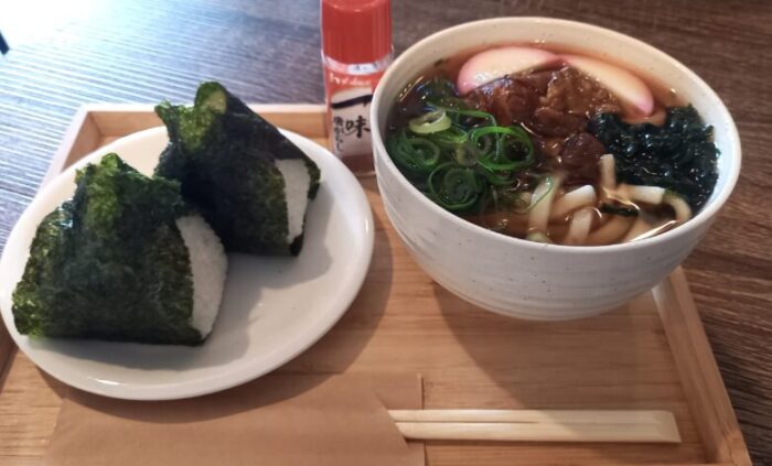 おにぎりは、通潤橋の水で育った白糸台地産のお米を使っていて、うどんのおつゆと相性抜群。