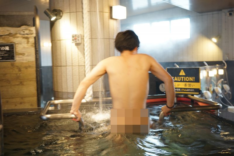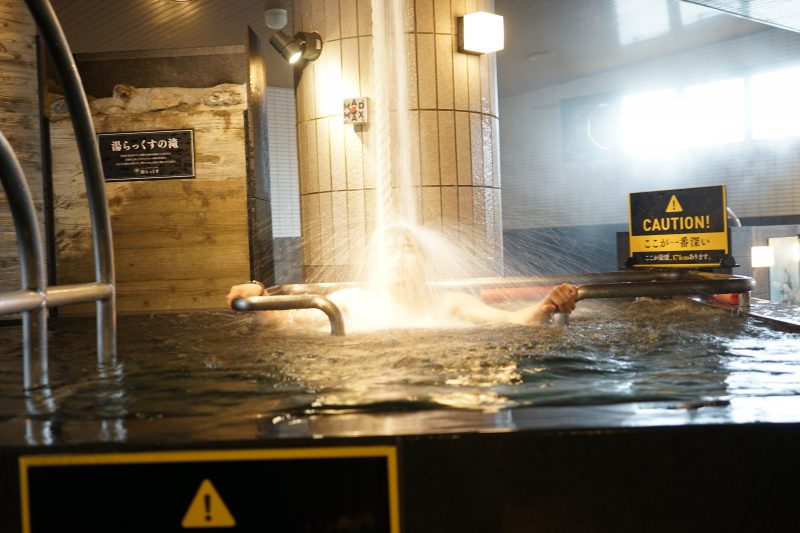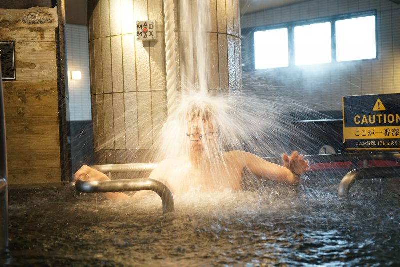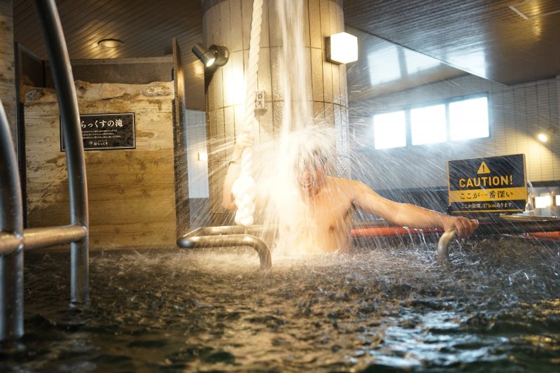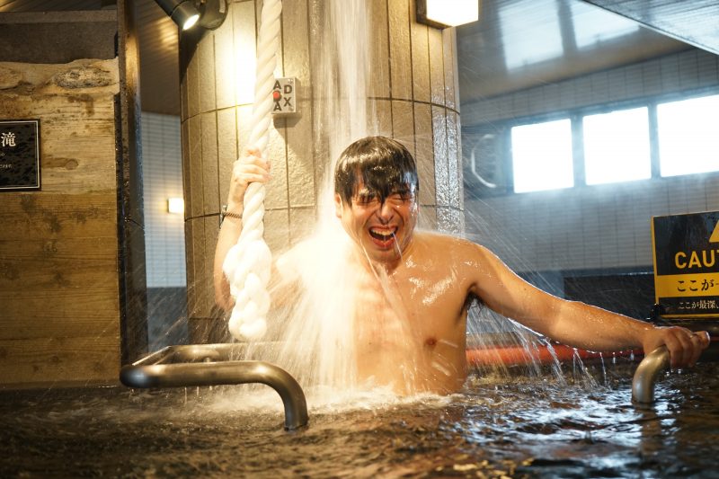 そうなんです!うちの水風呂は日本一深いんですよ。最深部で男湯で171cm。女湯で153cmあるんです。水温は15℃をキープし、設置してある「MADMAX」ボタンを押すと、毎分150リッター以上の、阿蘇の伏流水が滝のように上から降ってきます!溺れないように天井からぶら下がっている「ガンダタの糸」にしっかり捕まっていてくださいね。
