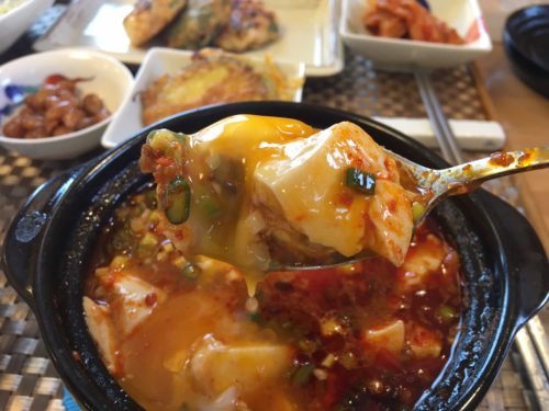 豆腐のふわふわ感と辛いスープ、卵黄のまろやかさが調和して、これぞ韓国料理!顔に汗がにじみます。