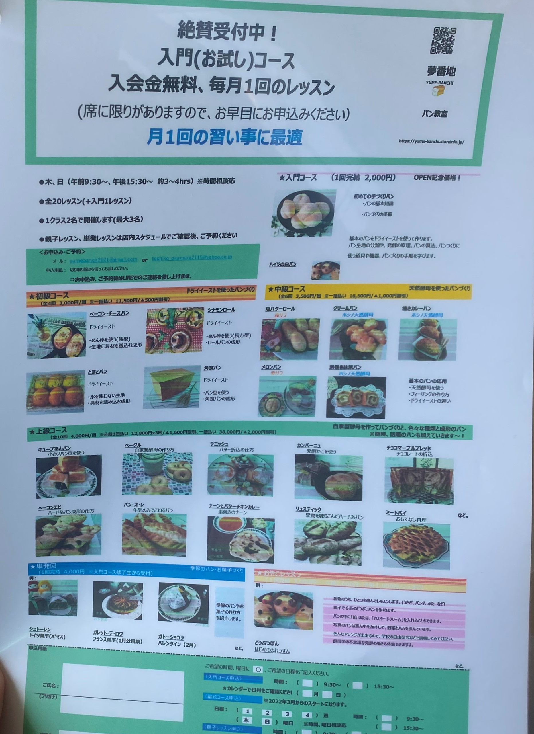 パン教室は初級から上級まであり、お子さんと一緒に通われている方もいらっしゃるそう。上級者は天然酵母の作り方まで教えていただけるようで、月に1回だけとか、好きな時に予約できるから、忙しい方も通えそう。初めての予約は直接お店でされると間違いないようです。