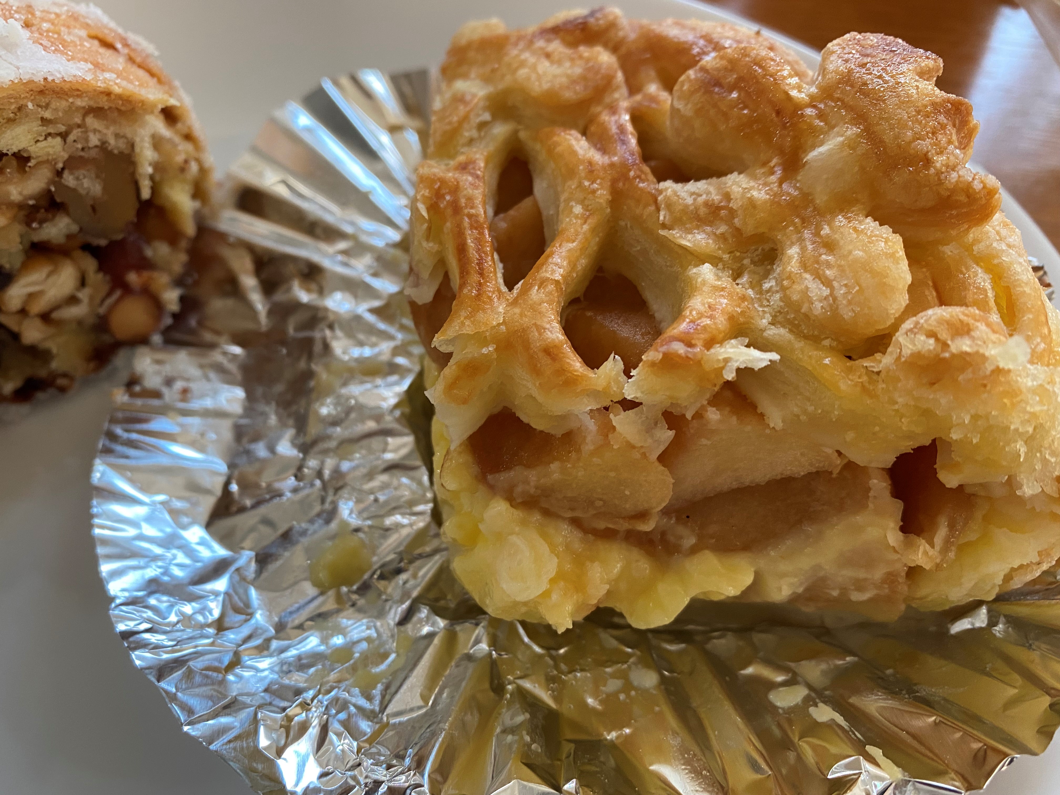 一番人気のアップルパイとシュトーレンを実食。アップルパイは1/4サイズでリンゴとカスタードがゴロゴロ入ってバターの香りがしておいしい!2人で食べてもよさそうなボリューム。