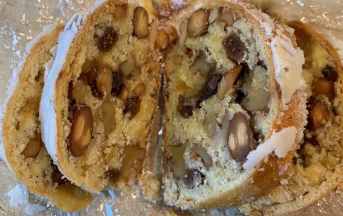 シュトーレンは中身がたっぷり。ハニーローストした落花生、ドライイチジクやナッツ類、ラム酒で甘露煮したレーズン、オレンジピール、レモンピール、チョコチップ。口に入れるとナッツの香ばしい香りとレーズンのしっとり感、イチジクの食感。最後にオレンジピールのさわやかな香りでクリスマス前に食べてしまいそう。