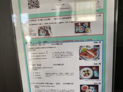 11時からのランチは「ホットサンドプレート(8食限定)、ピッツアセット(4食限定)、ナンとバターチキンカレーセット(4食限定)どれも500円!ワンコインで食べられます。