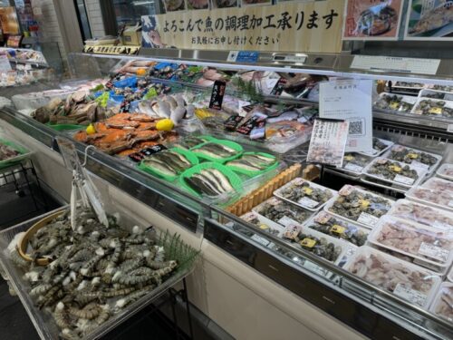 下ごしらえしてくださるお魚売り場。海老がでかい!