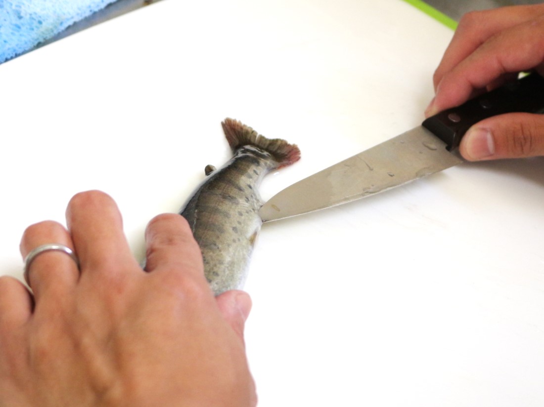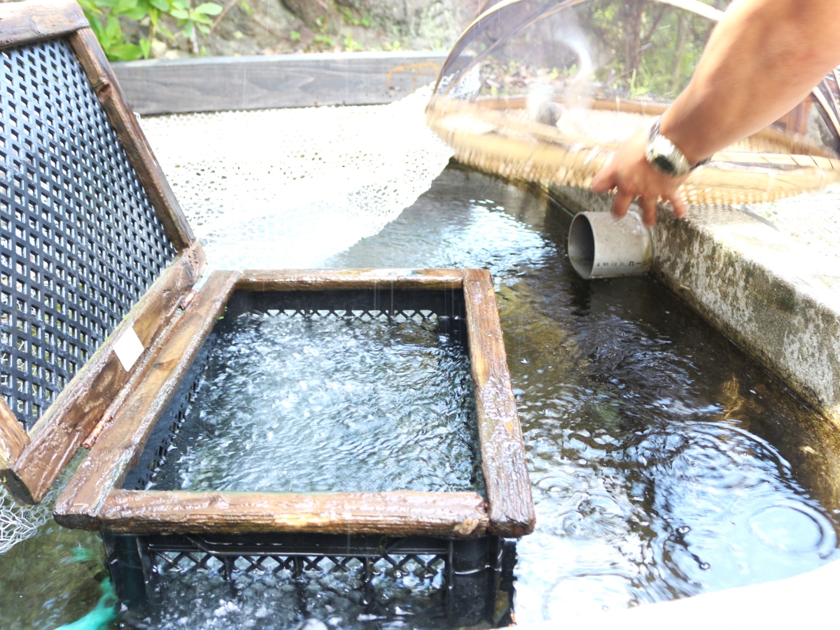 山女魚は、お店にある生け簀で泳いでいるものをその日に捌くので新鮮そのもの。その様子を見せてもらいました。
