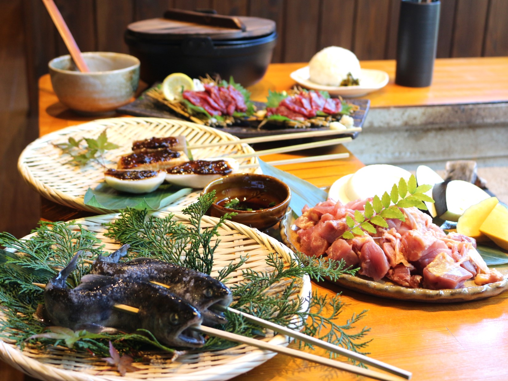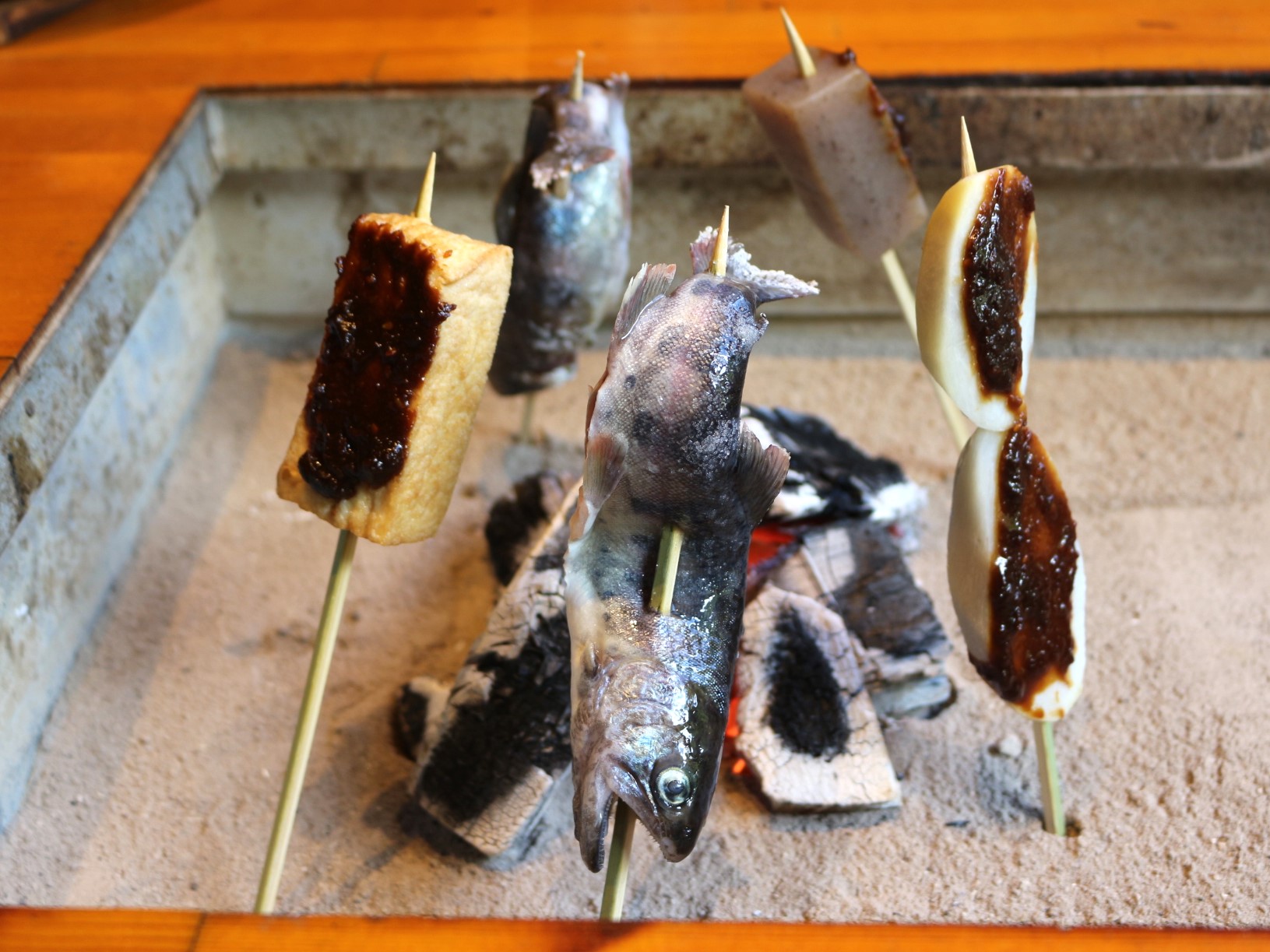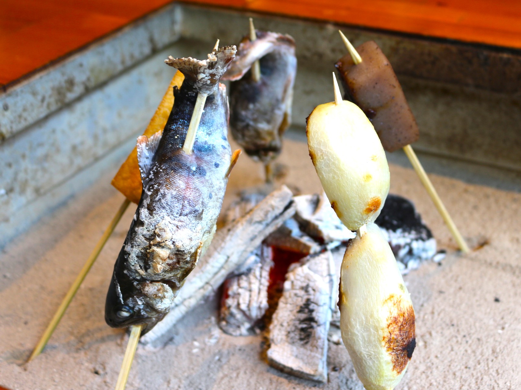これらを囲炉裏に好きなようにセット。山女魚は生でも食べられるほど新鮮で、田楽の野菜は火が通してあるのでお好きな焼き加減で食べられます。