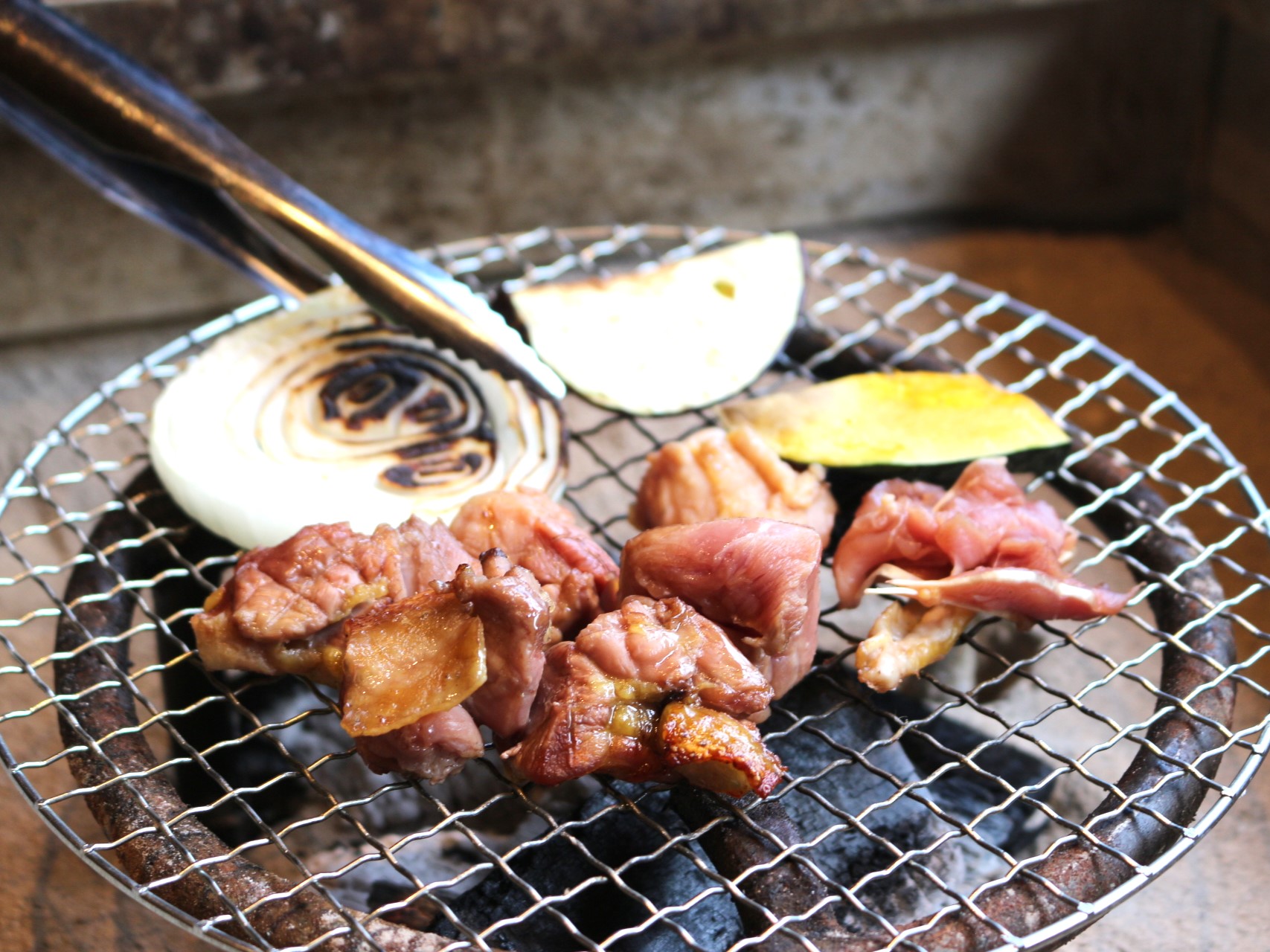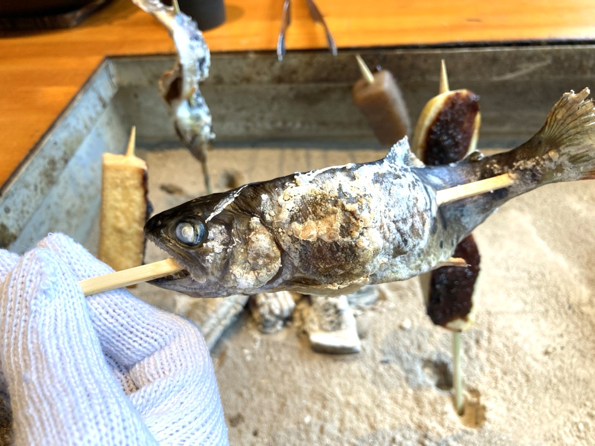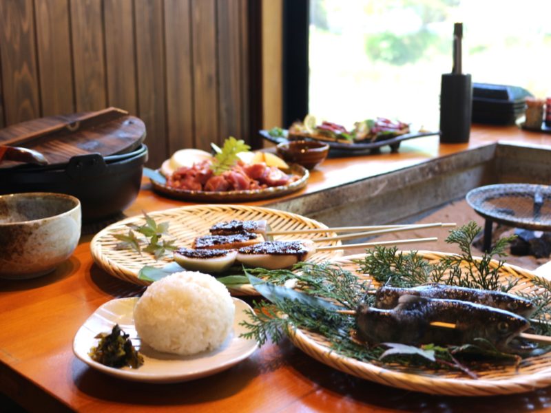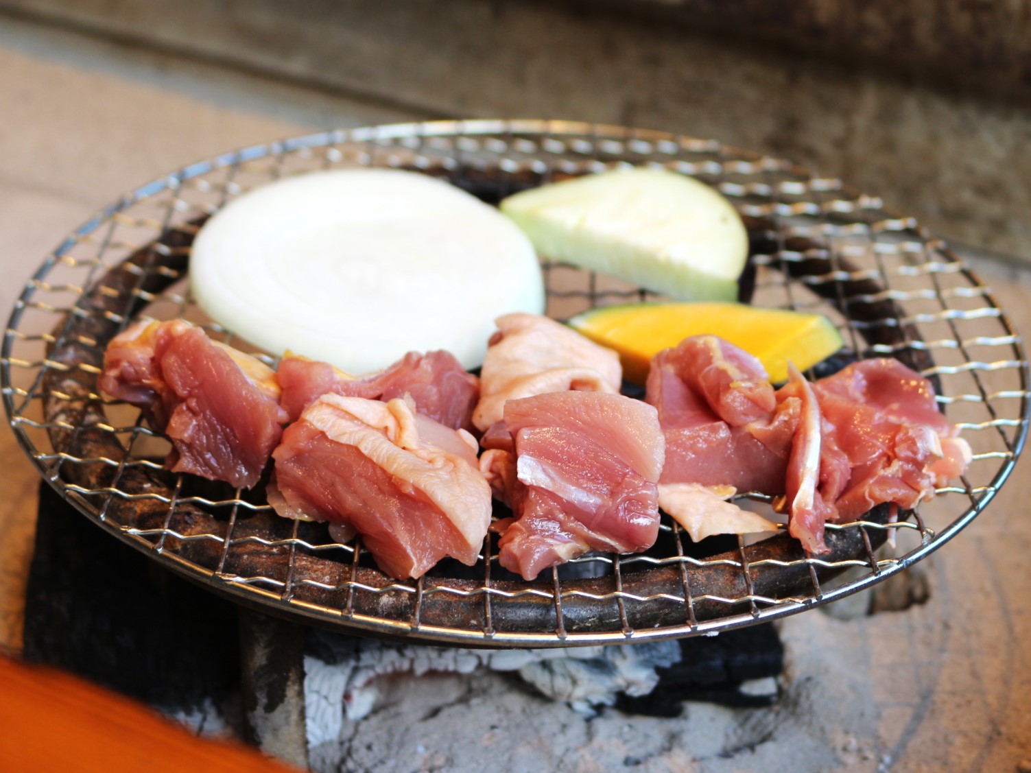 これらを囲炉裏に好きなようにセット。山女魚は生でも食べられるほど新鮮で、田楽の野菜は火が通してあるのでお好きな焼き加減で食べられます。