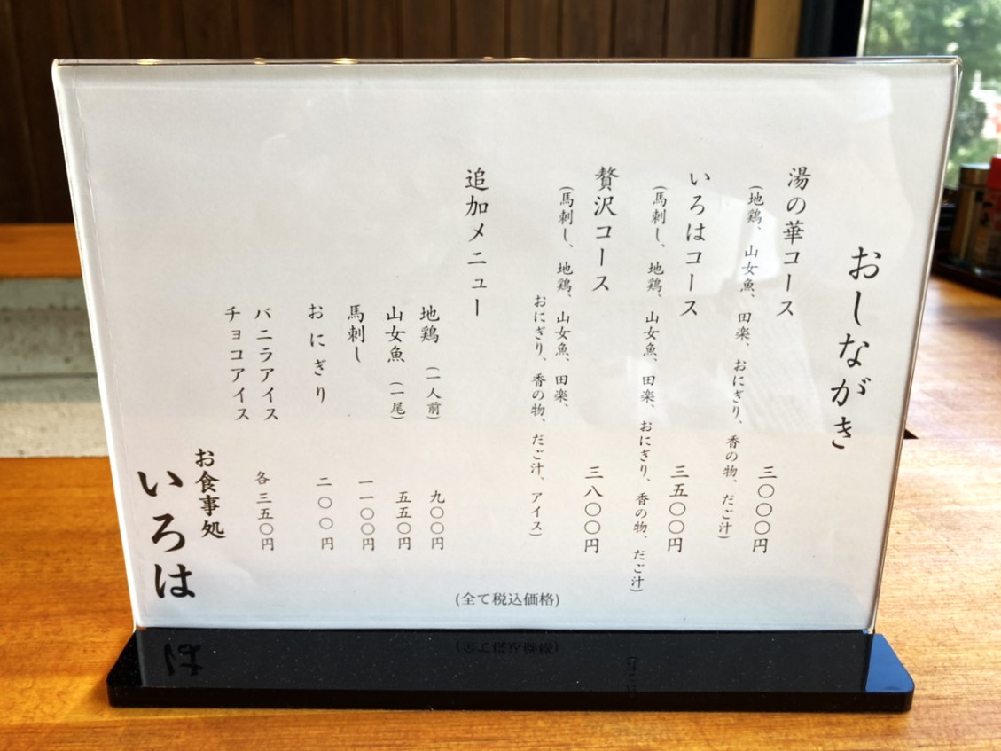 こちらで頂けるのは山の幸が存分に楽しめるコース。スタンダードなコースでも、地鶏、山女魚、田楽と盛り沢山ですが、今日は自分へのご褒美なので贅沢コースで!贅沢コースは、湯の華コースに馬刺しとアイスが追加されます。