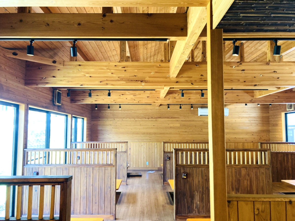 店内は、柱や梁が見えて木のぬくもりを感じる雰囲気。大自然の中に溶け込んでいます。