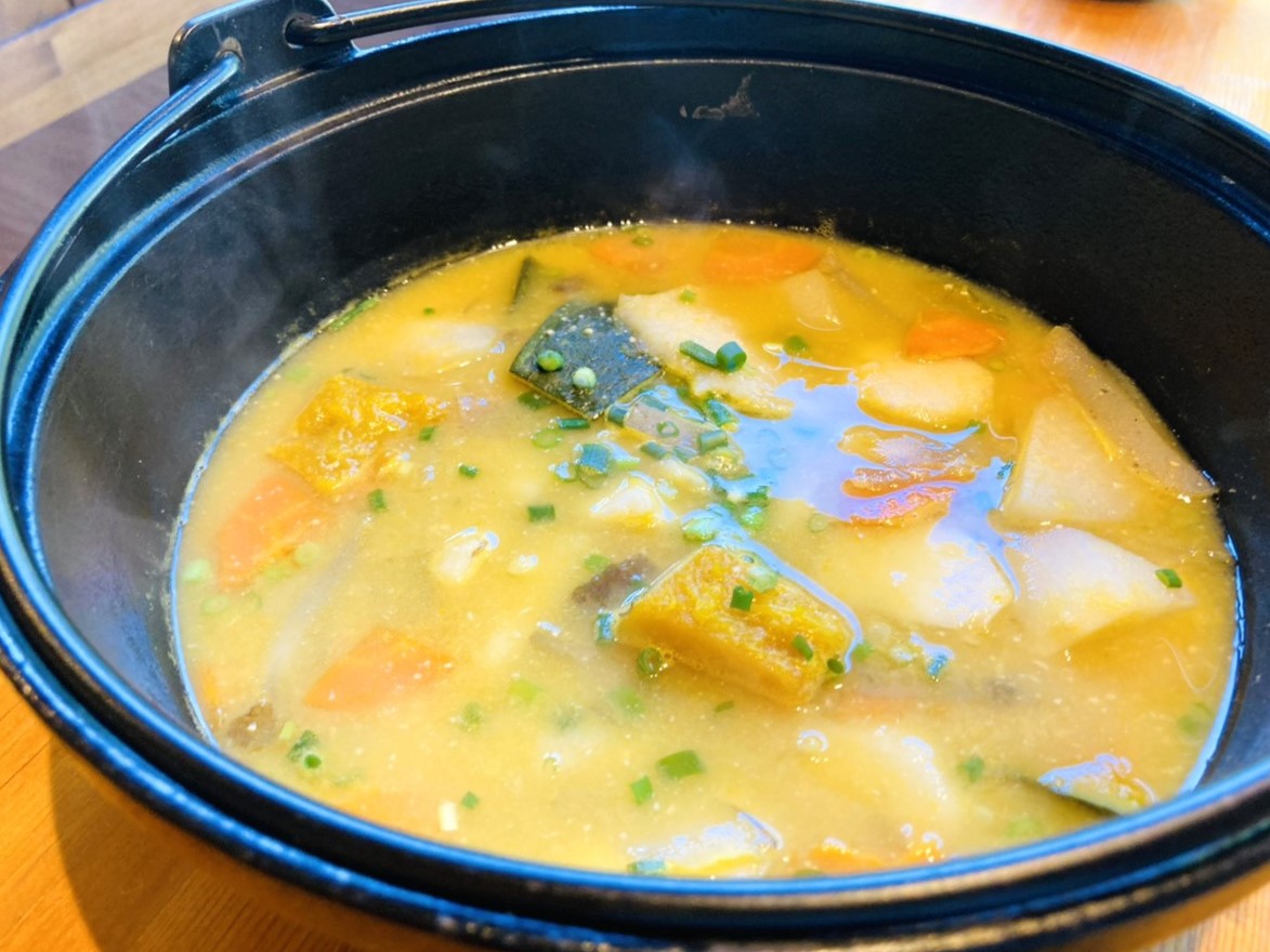 ぐつぐつ煮えているだご汁。ゆっくり頂きながら待ちましょう。