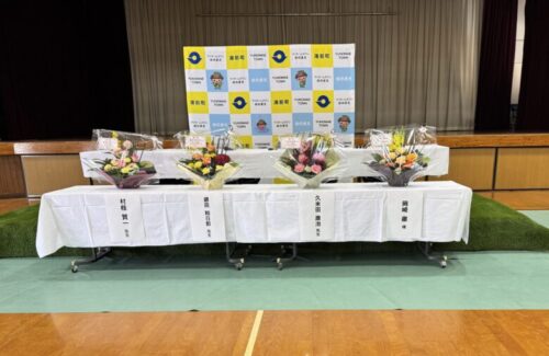 役場の課長さんたちは、ワンピースの海軍コート。湯前町のマスコット「ゆっくん」が羨ましそうな目で見ています。