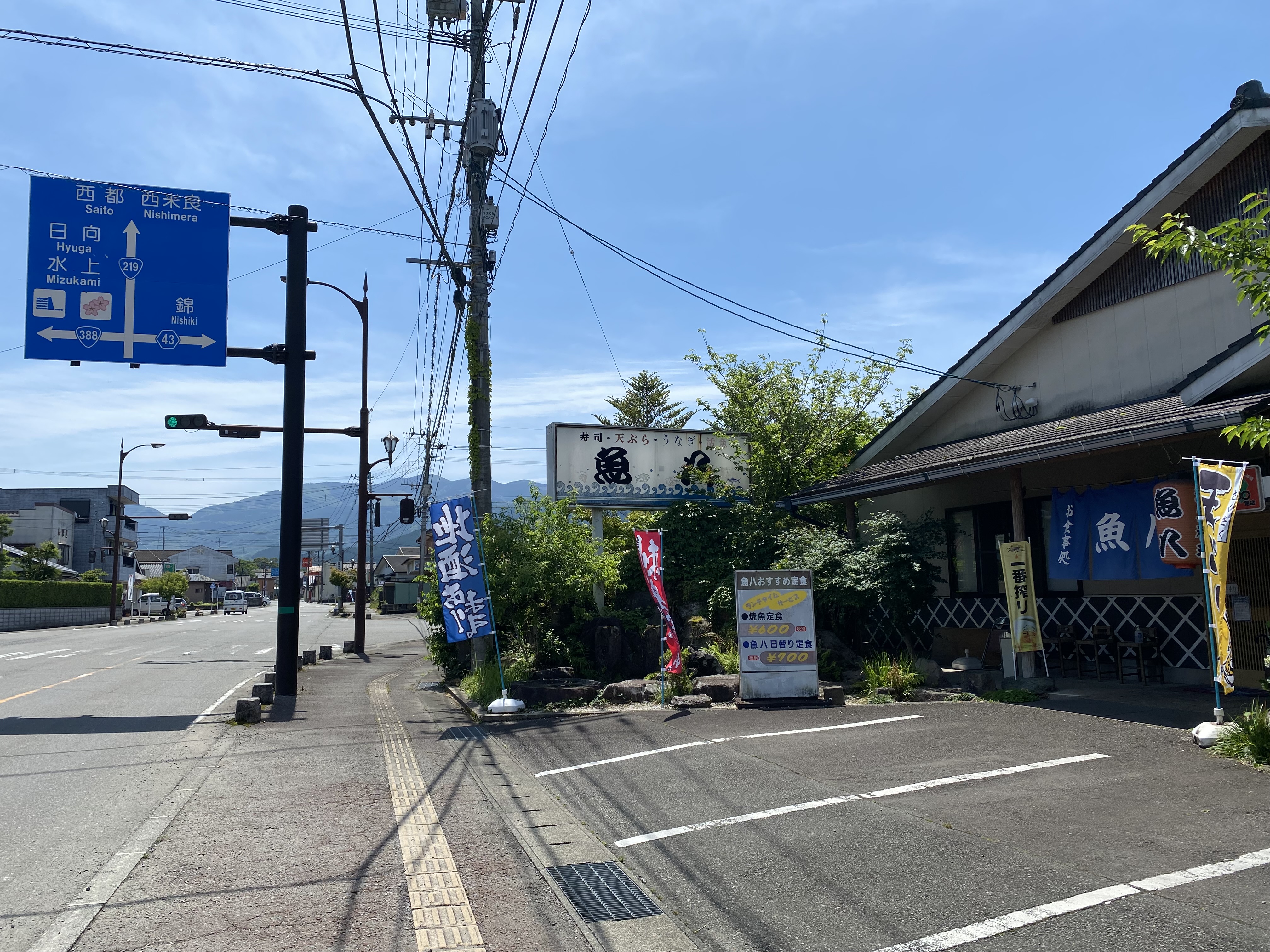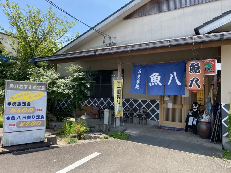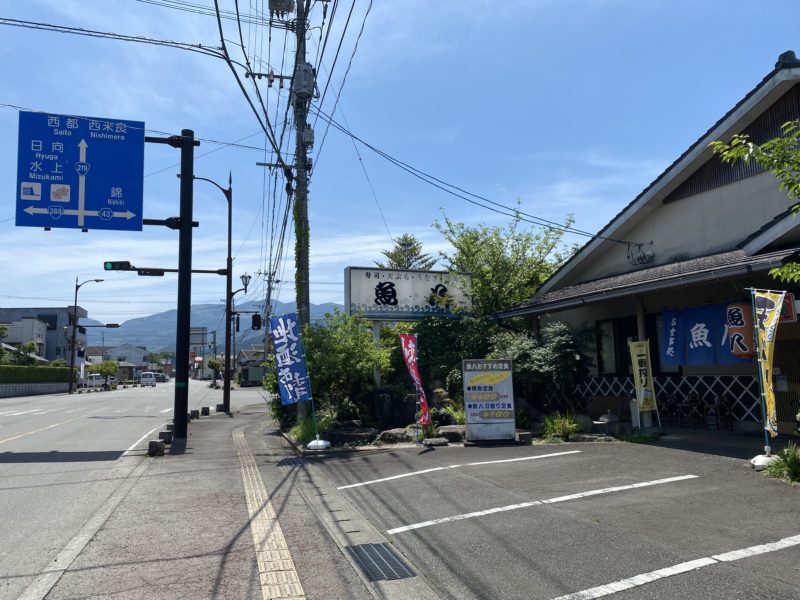国道219号線沿いの湯前駅の近くに魚八はあります。
