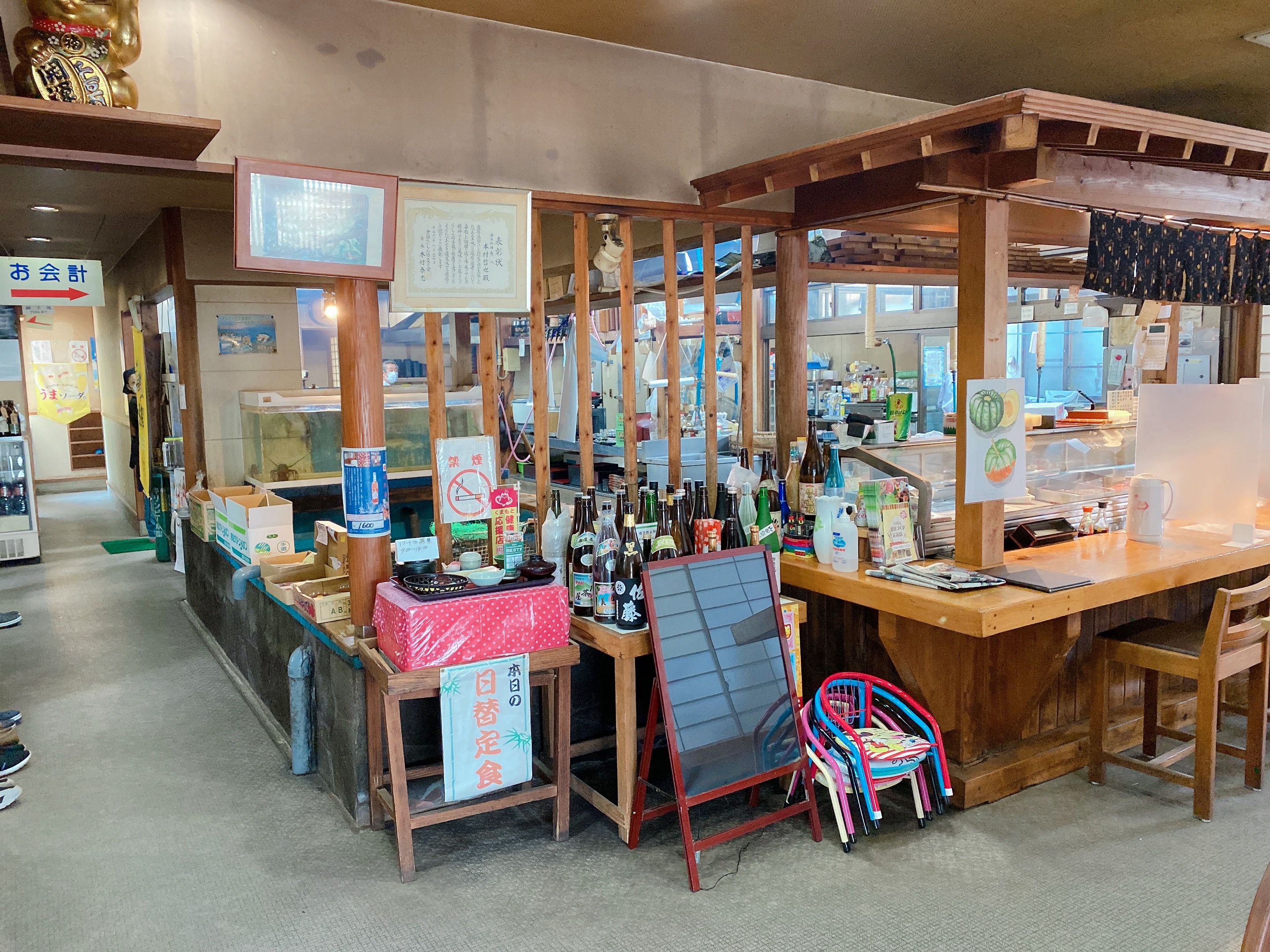 湯前町で30年以上愛される老舗の和食屋「魚八」で海鮮を自分で選んでごはんに乗せて食べる海鮮丼があると聞き行ってきたのですが、3月に開催される「どんぶり祭り」限定のイベントだそう。残念。。