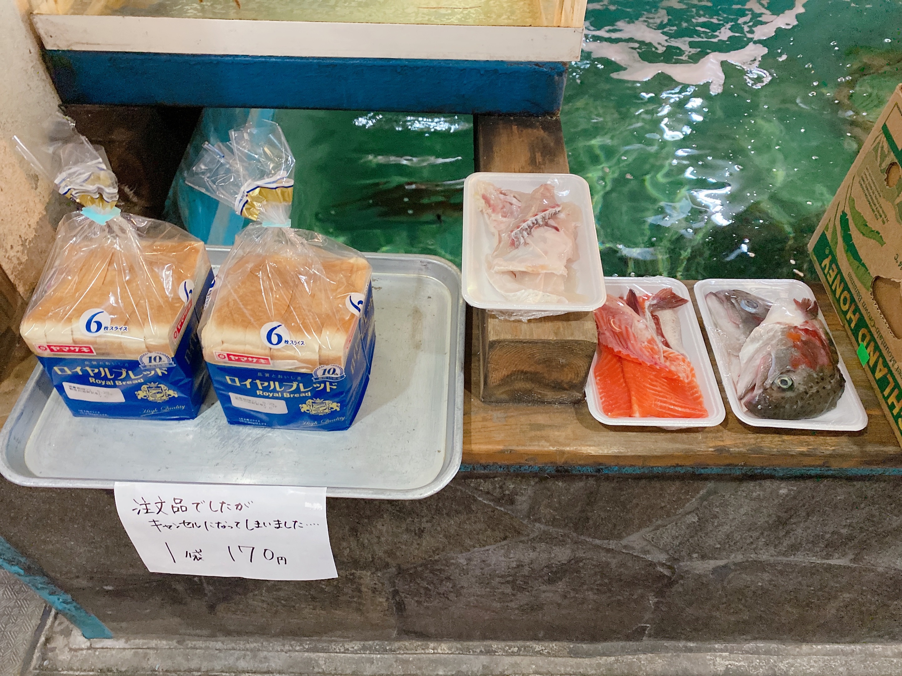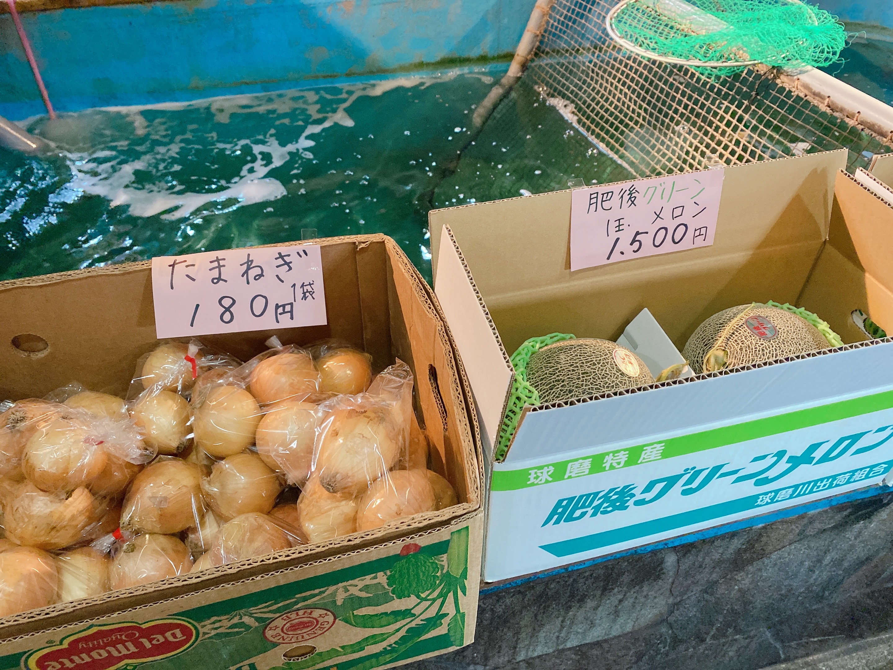 レジまで行く途中、生け簀のふちに玉ねぎやメロンの販売もされていました。