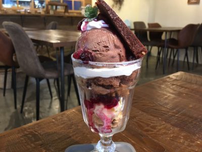 パフェグラスの中には、手作りのチョコチップシフォンケーキや、ベリーのソース、バニラアイスなどがぎっしりつまっていて、上にはチョコアイスにマーブルケーキ。チョコとベリーの間違いない組み合わせに、ふわふわのシフォンケーキが絶品で幸せな気分になれるパフェでした。