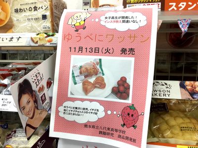 熊本県立八代東高等学校の生徒達とコンビニエンスストア・ローソンが共同で開発した新しいパン「ゆうべにワッサン」が今月13日から熊本県下155店舗のローソンで一斉に発売されました!熊本県の開発したイチゴの新品種「ゆうべに」を使用した品で、限定6万食の販売だそうです。