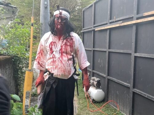 看板も血塗られていたり、スタッフの人たちは天冠と言われるゆうれいの三角巾をつけていたりと、ゆうれい祭りならではの雰囲気で、楽しいお祭りです。